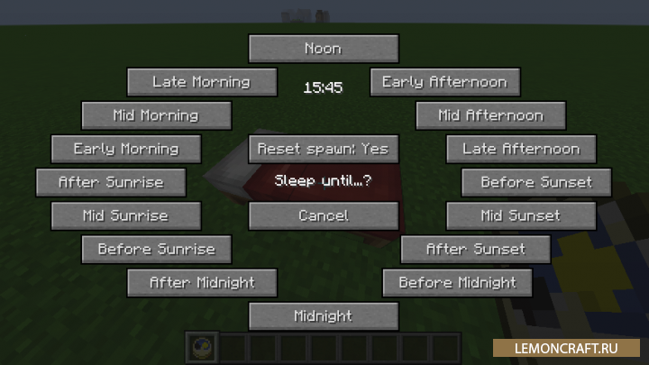 Мод на ускорение времени Somnia Awoken осуществляет симулирование и ускорение времени и мира, заменяя тем самым пропуск ночи. Теперь вы сможете ложиться спать когда вам захочется и сможете выбирать до какой отметки это делать.